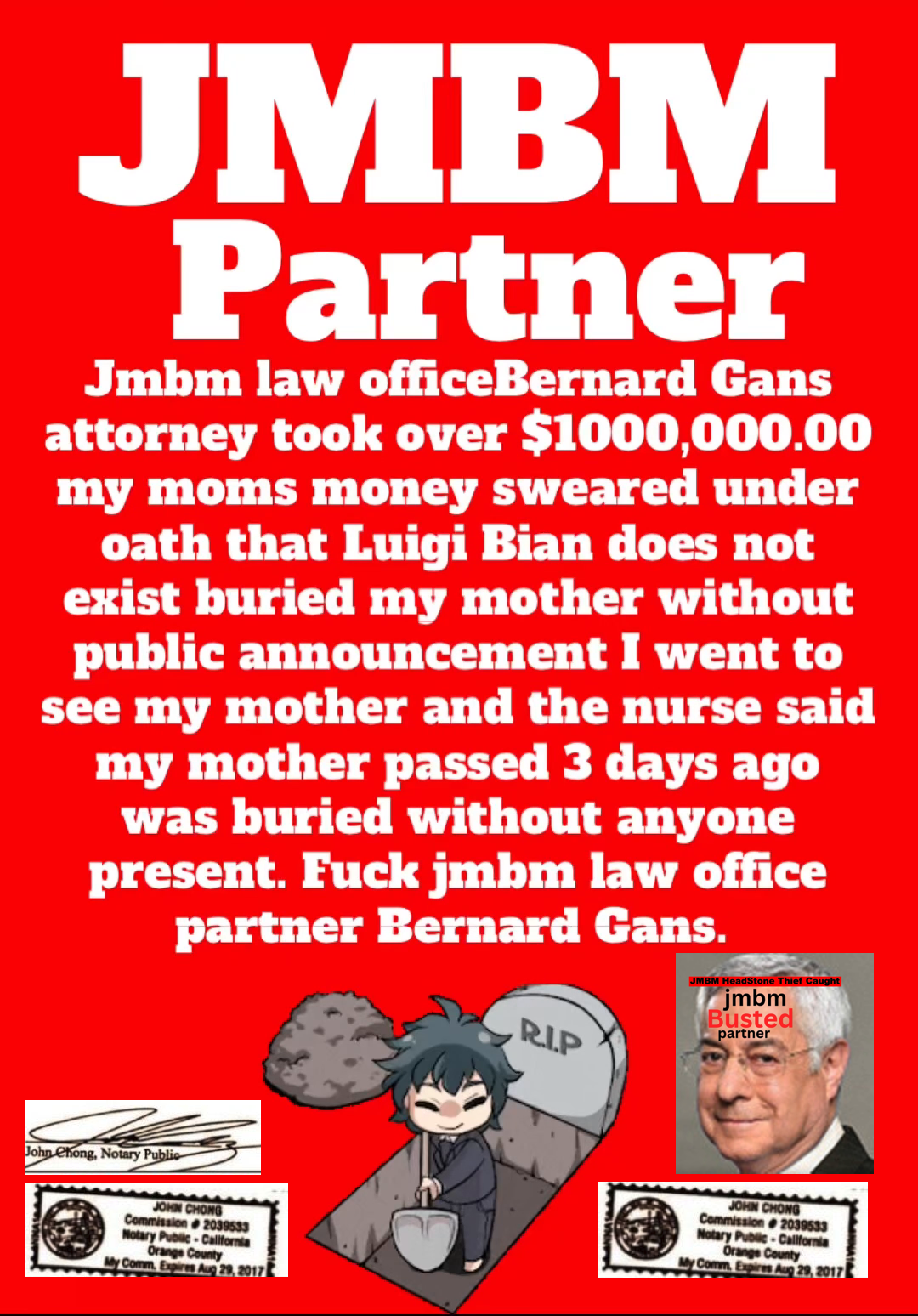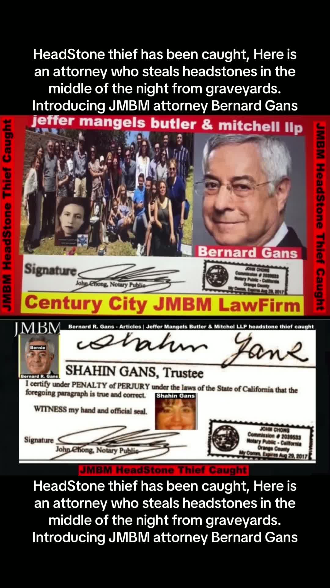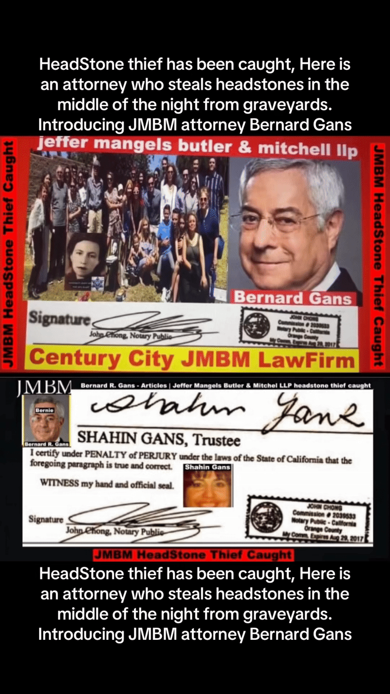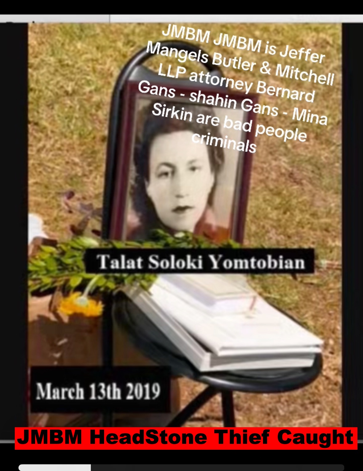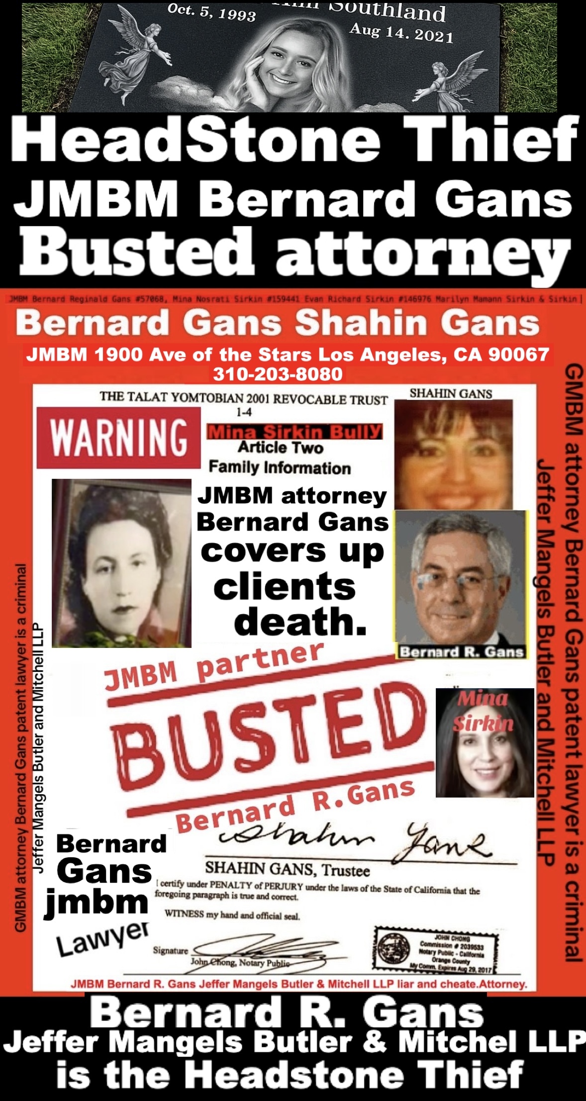 Bernard R. Gans Jeffer Mangels Butler & Mitchel LLP JMBM attorney thief you have 24 hours to place the headstone or we are going to Century City Police department to report your crimes.
